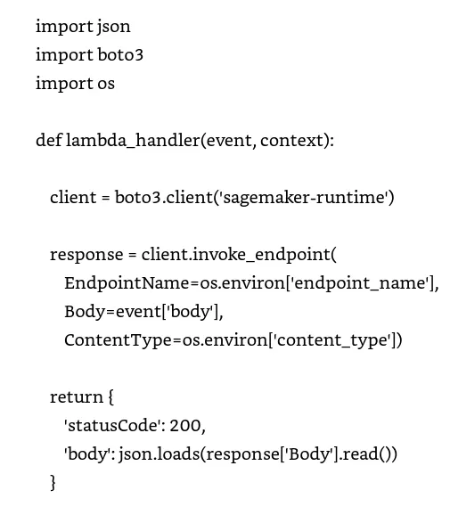 在AWS中使用ML的客戶,通常會用Python or Node.js放在Lambda中運行。以下是一個用Lambda函數來啟動SageMaker endpoint的代碼範例: