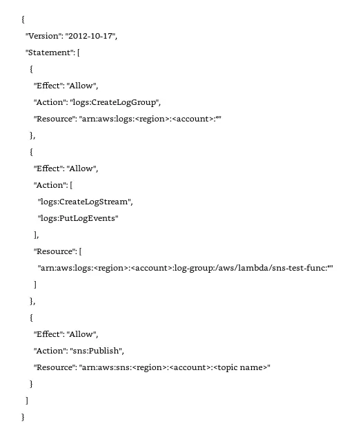以下的execution role讓我們的Lambda可以push log到CloudWatch中(包含了當我們create Lambda函數的basic execution role)。與Push 一個SNS topic: