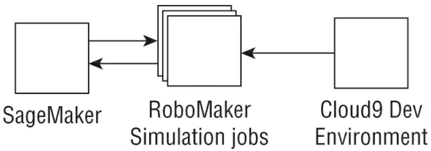 通常,我們的 ROS setup 包括從source 安裝許多package,並選擇我們要在 AWS 上的哪個服務(例如,EC2 instance、container)運行開發環境和模擬。 借助 AWS RoboMaker,我們可以使用 Cloud9 insatcne,這個insatnce已經整合了開發robot application所需的工具。 遵循的典型步驟是在此開發環境中建立custom application(包括一個場景中的機器人、地形和其他資產),開發模擬環境並在模擬作業中進行測試,最後,如果需要,使用 AWS Greengrass 部署這些Application 到robot fleets。 雖然我們可以以獨立的方式使用我們的模擬環境,但通常也將其與 SageMaker 結合使用,例如,與reinforcement learning job一起使用。