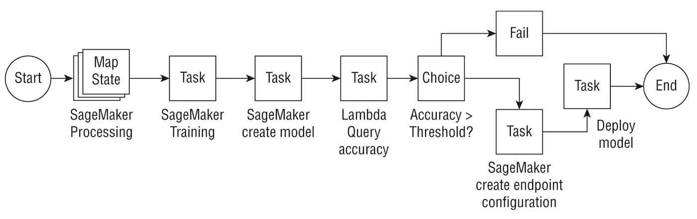 上圖中,首先我們使用Map state來運行數個 SageMaker processing job來平行的預處理(preprocessing)資料; 之後我們用 SageMaker訓練一個model,並且使用 CreateModel API來建立Model。再來使用一個自訂義的Lambda函數來 query一個精確的training job(validation),還有假如精準度是大於Predefined threshold(Choice state),例如大於85%, 我們就建立一個 SageMaker endpoint configuration並且部署模型,如果沒有(Fail state),模型就不部署。