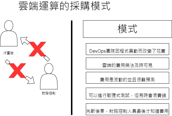 今天的雲端運算採購模式則完全翻轉了傳統模式。因為傳統的IT團隊轉變為DevOps團隊。而這個新的團隊因為雲端運算的特性 — IaC (Infrstructure as code)加上自動化得以讓IT的相關花費直接發生變化,而這樣也讓IT費用的傳統相關控制措施失效了。這對企業的財務不是好事,而且企業也失去了整個IT相關花費的能見度。