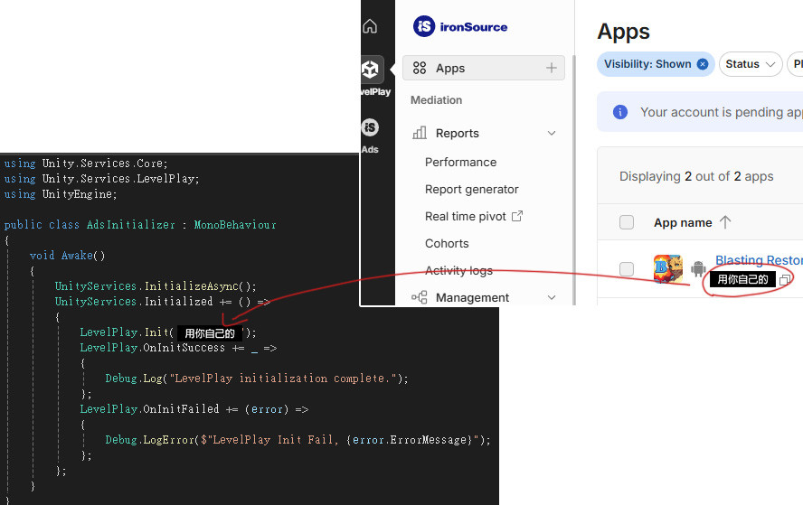還有LevelPlay.Init需要的appKey可以從LevelPlay的後台->Apps( https://platform.ironsrc.com/partners/home )找到