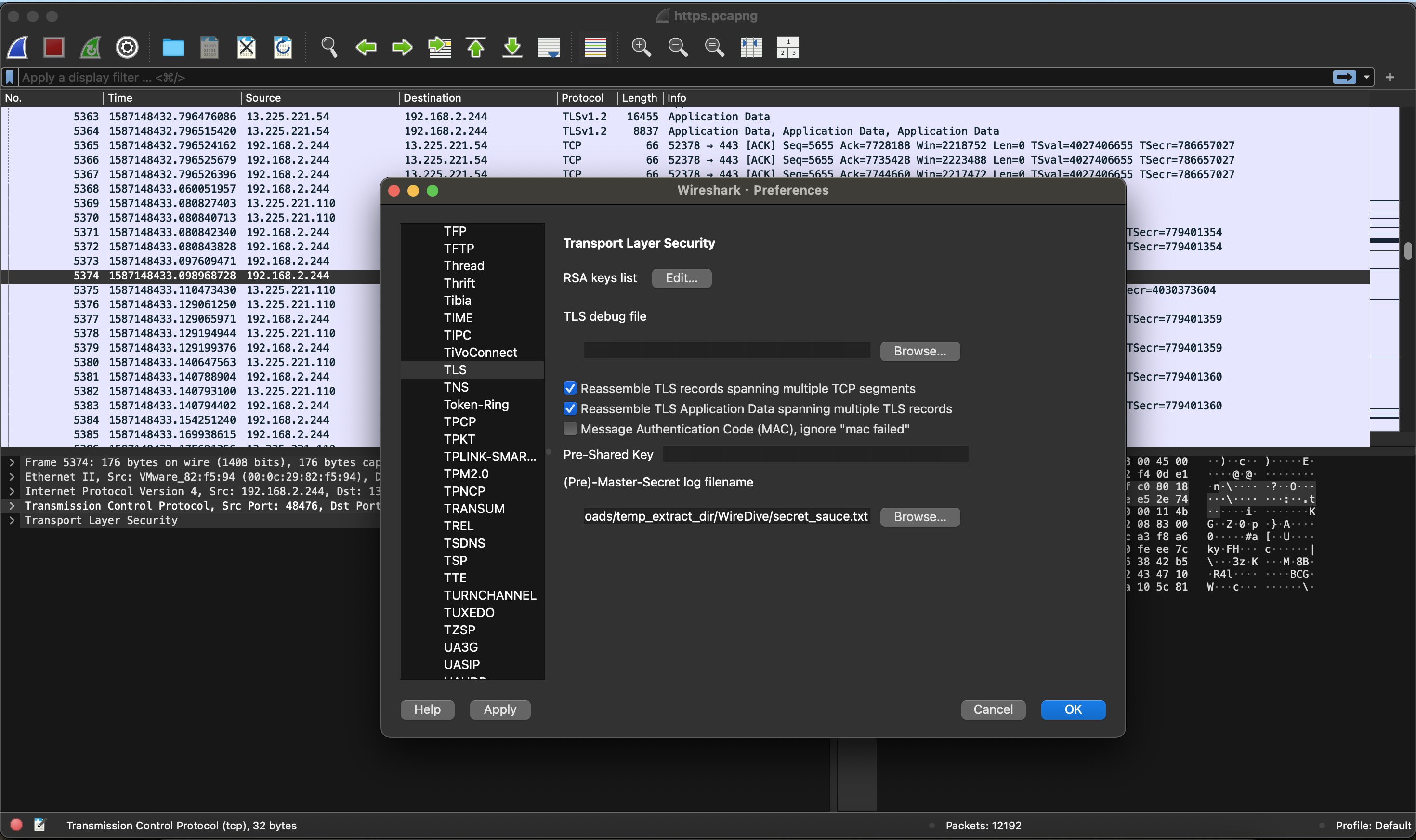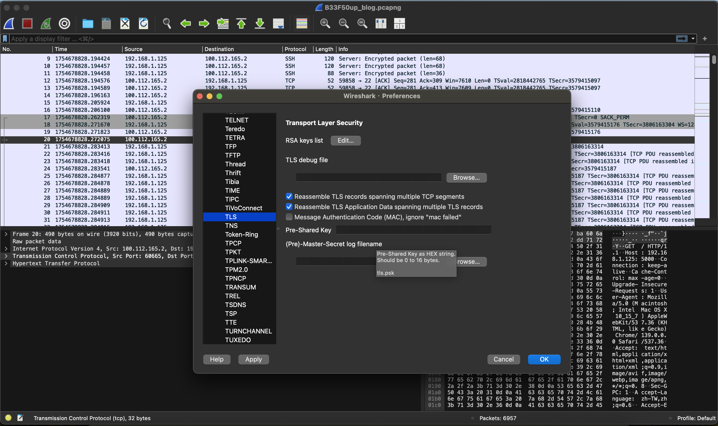 然後再Preferences-> Prorocols 裡面找到TLS ,接下來把剛剛儲存的key 路徑丟進去最底下(Pre)-Master-Screct log filename