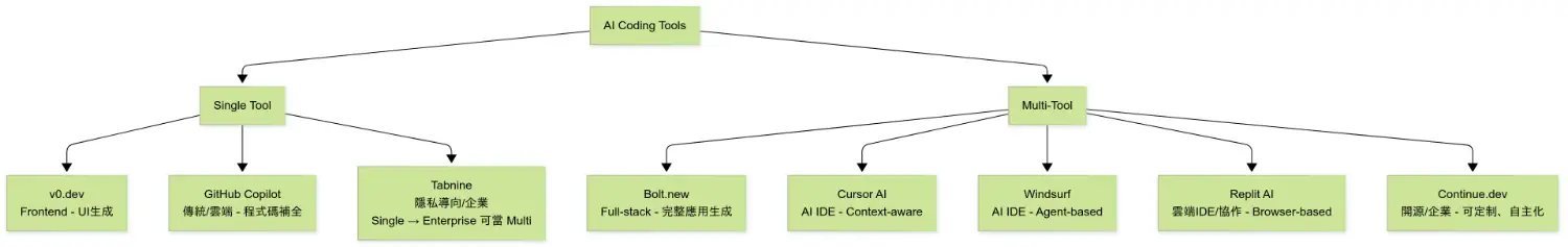 v0.dev(前端專精)、Bolt.new(全端生成)、Cursor AI(AI-first IDE)、GitHub Copilot(廣泛採用)、Replit AI(雲端IDE)、Continue.dev(開源方案)、Tabnine(企業隱私)、Windsurf(次世代IDE)