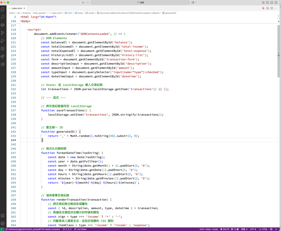 注意 AI 每次生成的實作方式都不太一樣,函式名稱也不一定相同,所以可以再跟 Gemini Cli 互動,請他把 JavaScript 各個步驟加上註釋。或是你的 JavaScript 程式碼貼回去 AI 中,請它解釋各部份的功能。