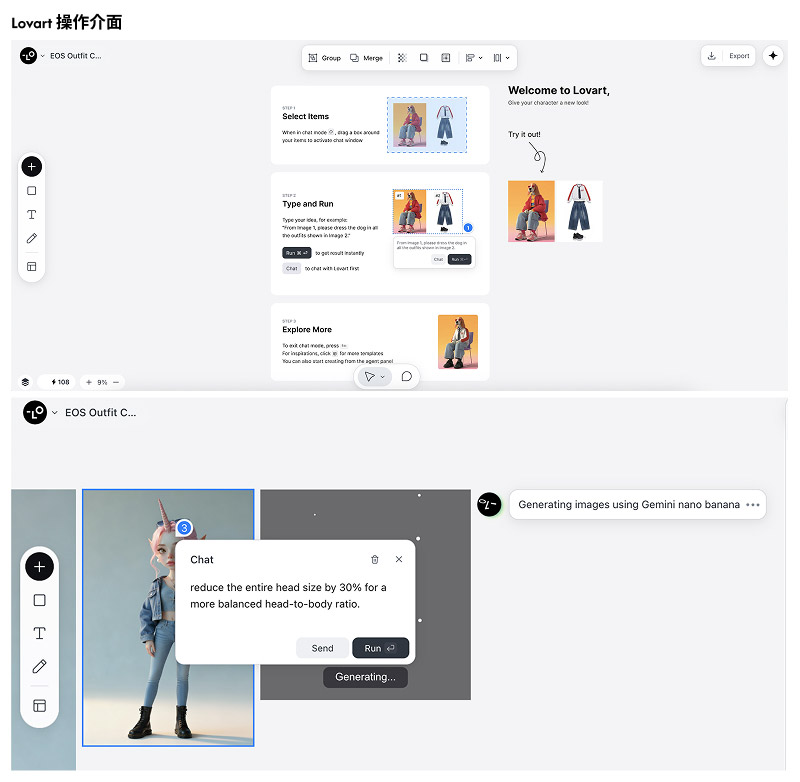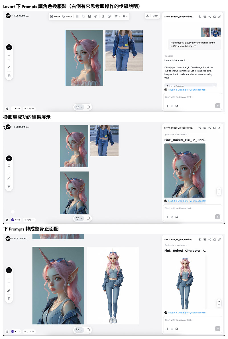 選圖、下指令、跟 AI 對話,甚至產出後的圖片整理——全部都可以在 Lovart 的畫布上一次搞定,真的超親民!