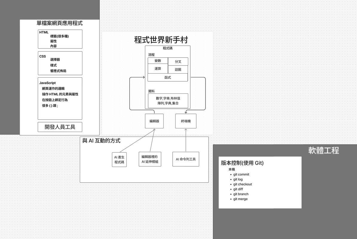 這塊地圖正式的名稱叫「軟體工程」,研究的是當程式愈來愈複雜的時候,我們要了解怎麼管理各種程式碼,有哪些工具,大家怎麼合作,怎麼做計劃等知識。