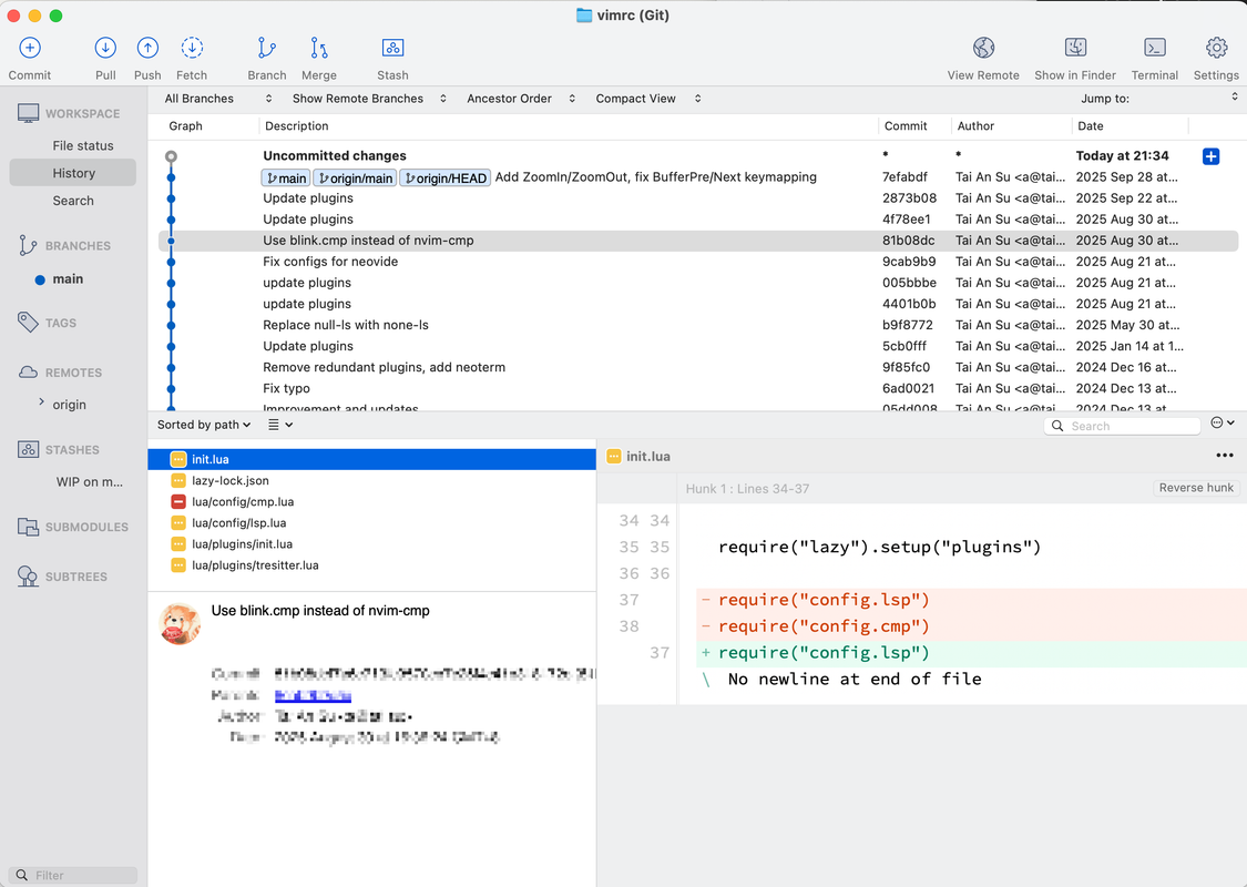下面是一個真的用 Git 管理的範例,可以看到在某一次的修改中,在init.lua