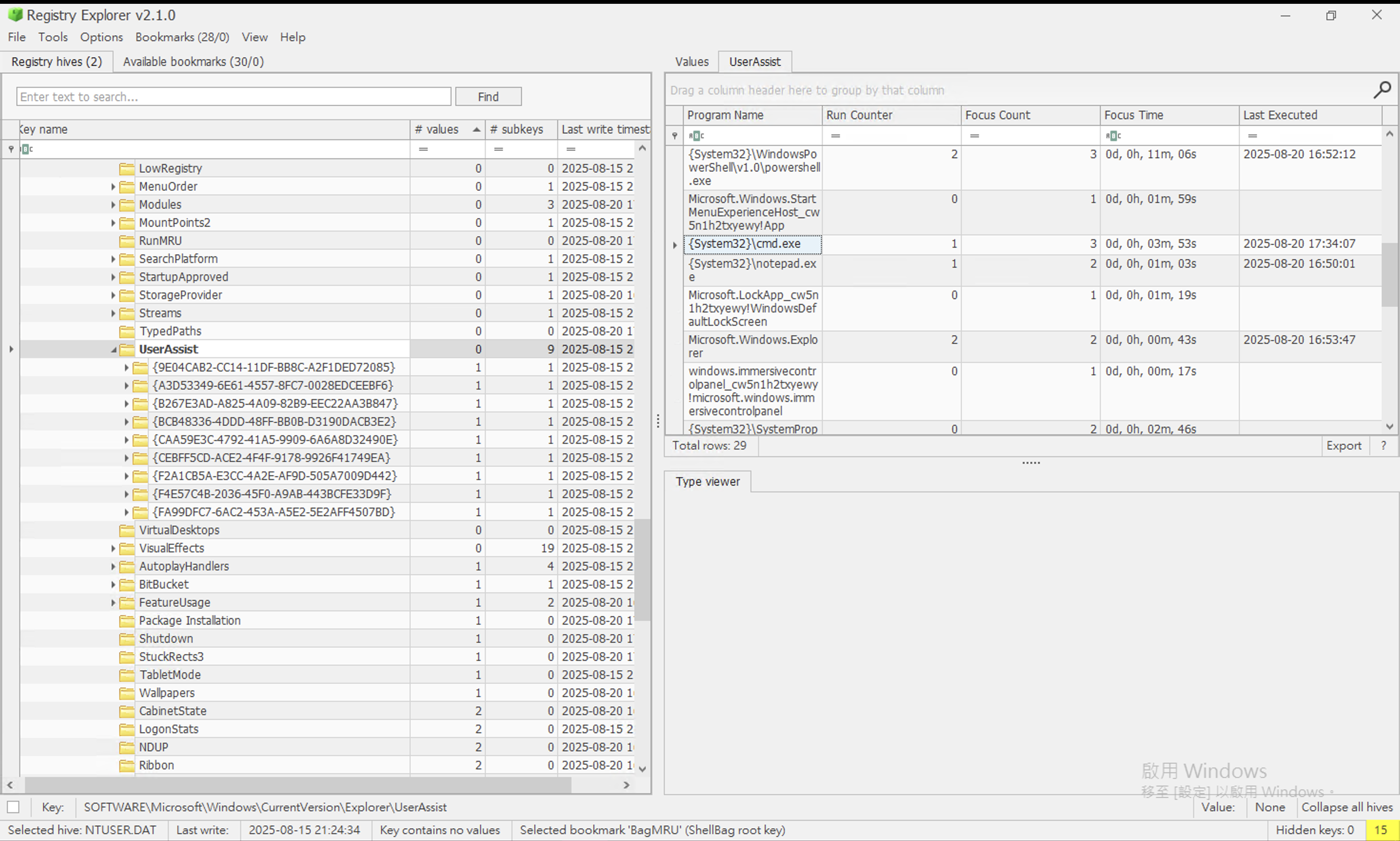 UserAssist 是 Windows 用來追蹤使用者透過圖形介面啟動應用程式或捷徑的統計記錄機制,裡面會包含程式的執行次數、最後執行時間、Focus Count、Focus Time
