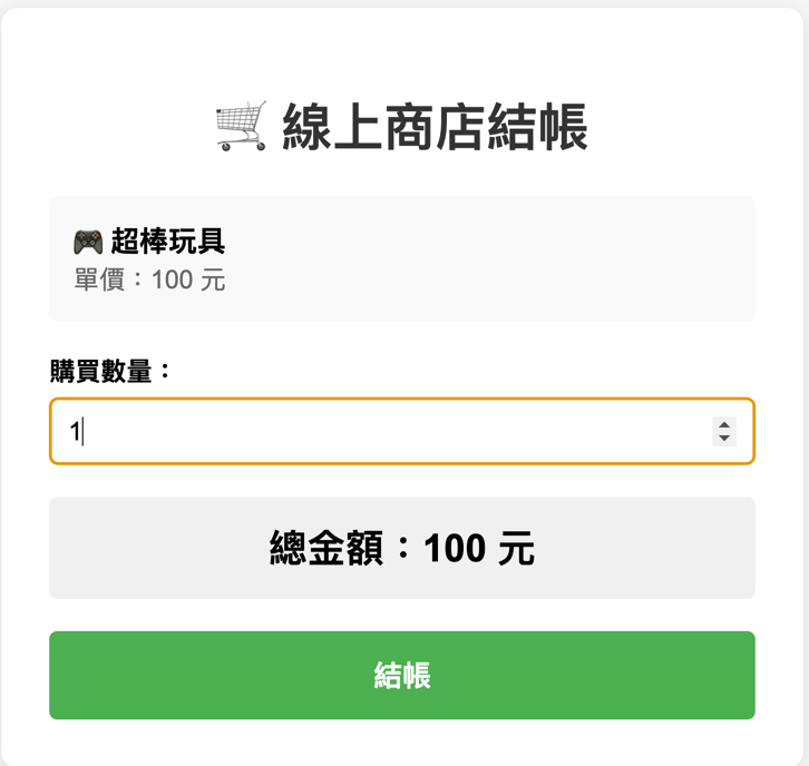例如我們做了一個賣玩具的線上商店,只賣我們自己做的「超棒玩具」,一個 100 元。商店的頁面長下面這樣。想買的人輸入他想買的數量,按下結帳,就會跟買的人收取底下「總金額」的價格。