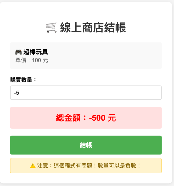 但是有個壞人來用我們的商店,他在「購買數量」的欄位裡,輸入負數!變成我們無緣無故要退錢給他!如果沒有檢查就讓商店運作的話,我們就損失慘重了!