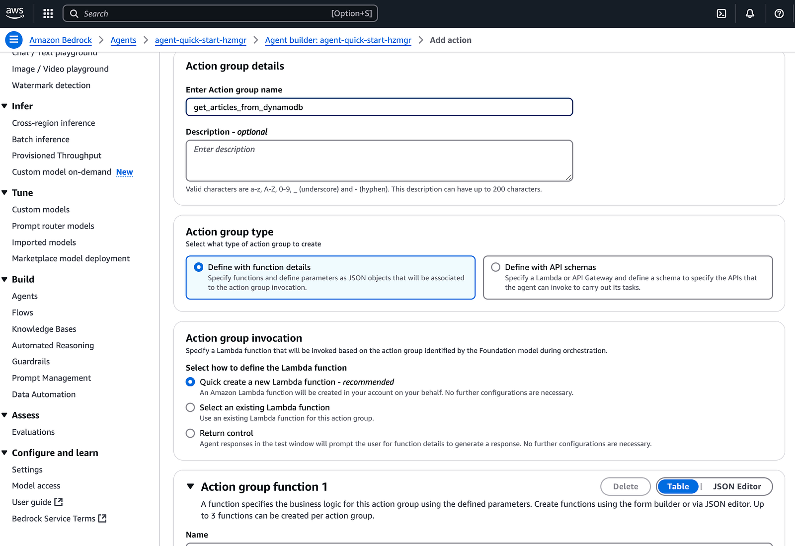 設定 Agent group 的時候需要選擇 type ,要想一下是要使用 function 的方式觸發背後的 Lambda?還是要以 API 的形式觸發 Lambda?也要決定要使用既有的 Lambda,還是要新增一個 Lambda 。