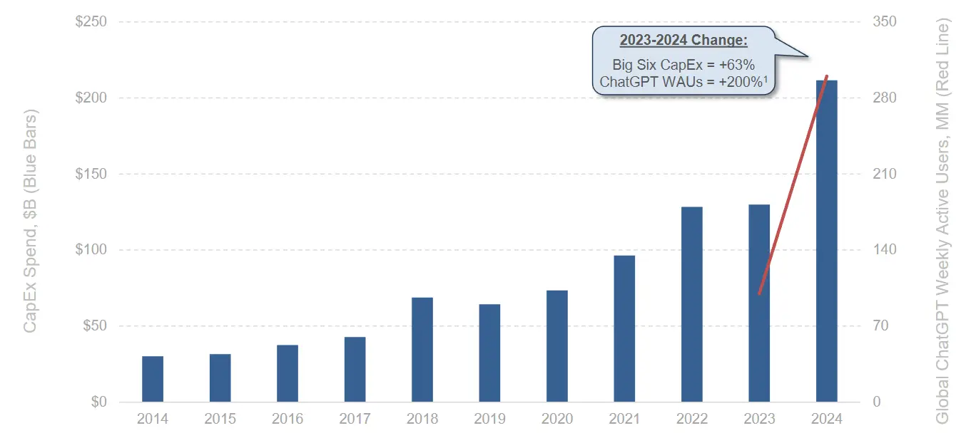 2014 年至 2024 年間,美國六大科技公司(包括 Apple、NVIDIA、Microsoft、Alphabet (Google)、Amazon (AWS) 和 Meta Platforms)的資本支出(CapEx)從 $330 億美元增長到 $2,120 億美元,年增長率高達 63%。這筆資金主要用於建構 AI 基礎設施。