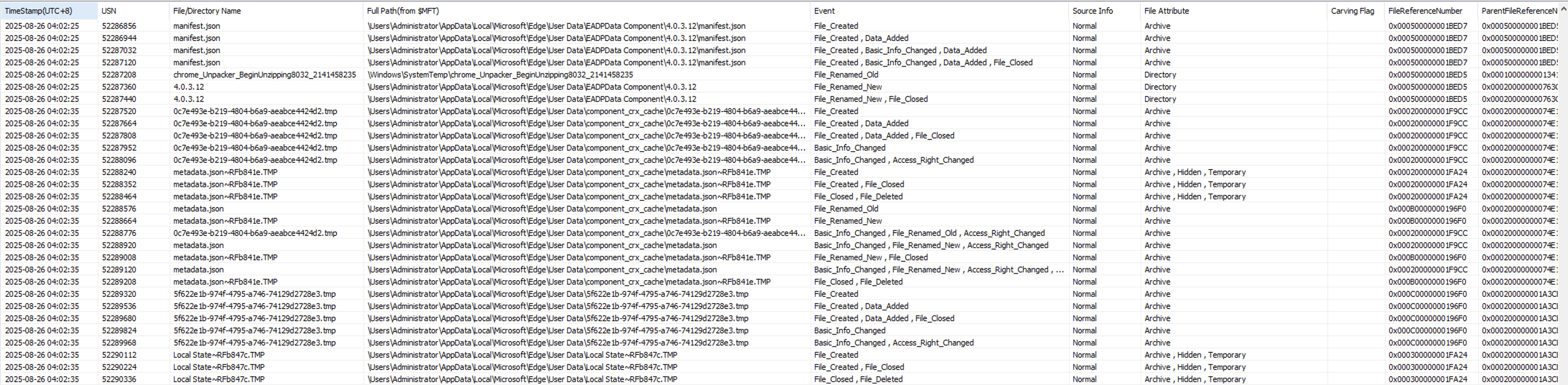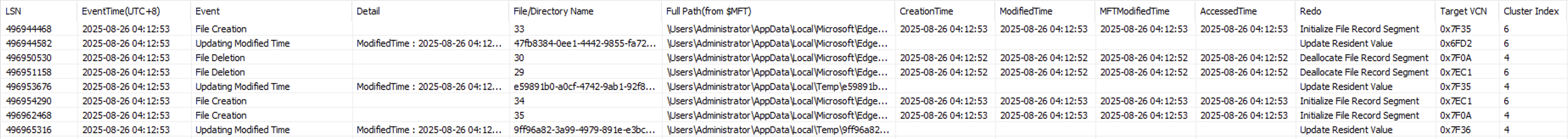 整體來說這些檔案記錄了從檔案/目錄的建立、修改、刪除、重命名、移動、屬性變更,底層交易操作(如 MFT 重組、索引更新)等所有可供恢復、驗證與時間線重建的線索。