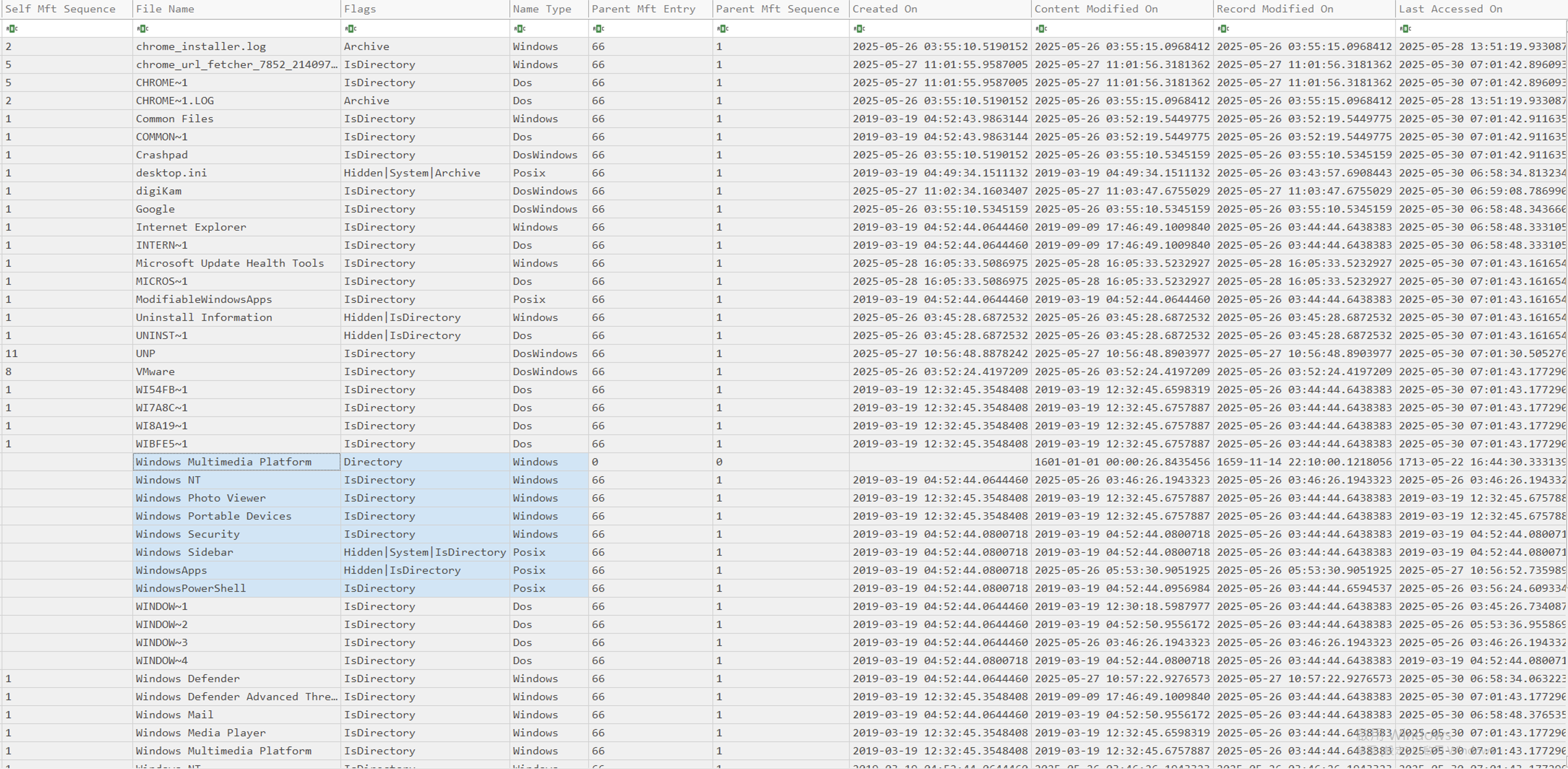 下方圖片是使用 MFT Explorer 把 MFT 內的資料視覺化顯示出來