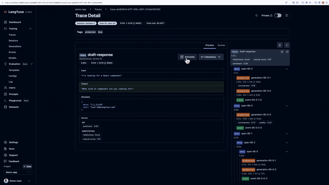 在 LLM 可觀測性平台中,你可以透過 UI 或 SDK,輕鬆地將生產環境中捕獲的真實追蹤(Traces)標註並儲存為黃金集,實現數據的持續積累。