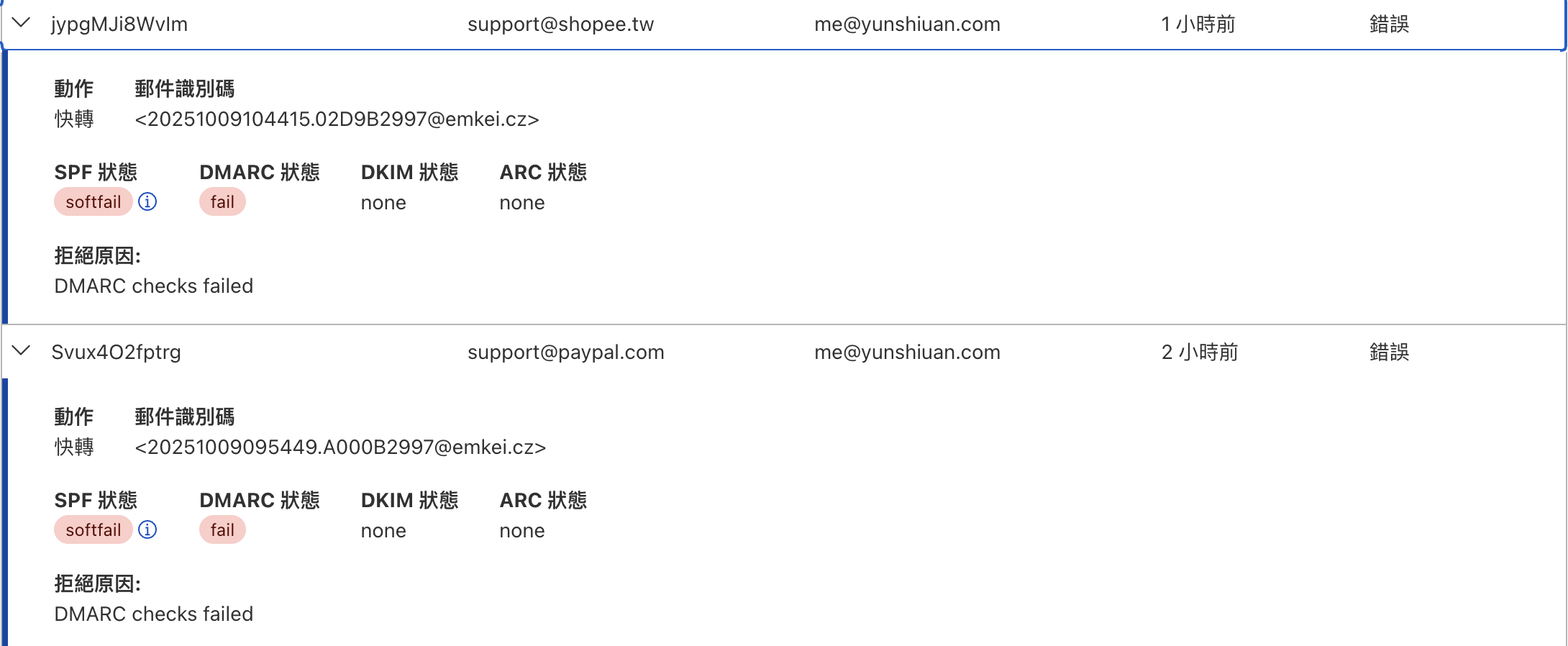 我在 demo 時寄到我個人的信箱,使用 Cloudflare 的 Email Routing 功能轉發郵件;因此當我把釣魚信寄到自己的信箱時,因未通過 DMARC 驗證而被拒收。
