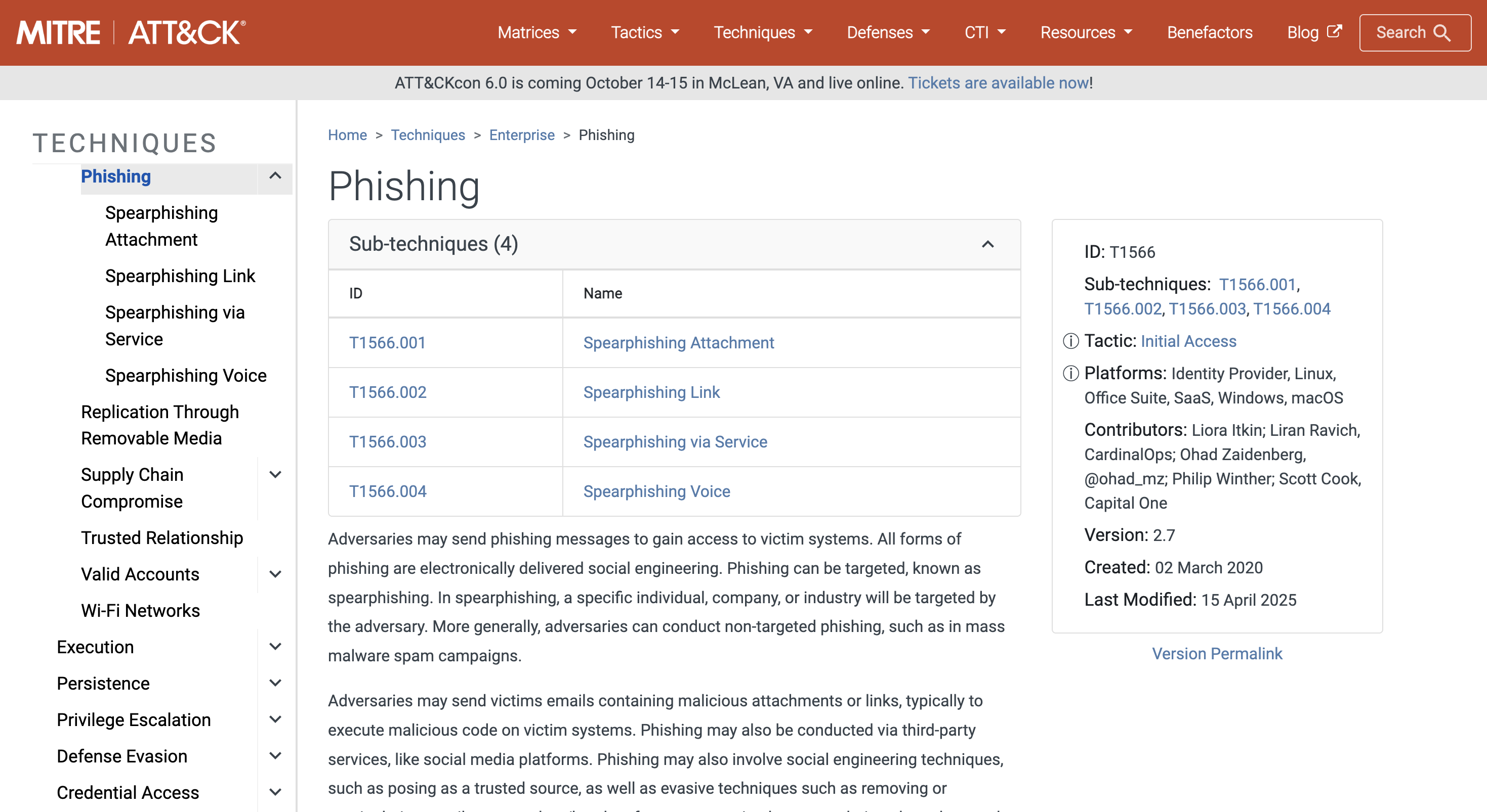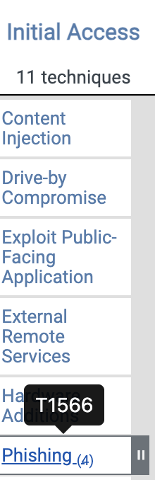 這邊舉昨天提到的釣魚攻擊為例,釣魚攻擊屬於 Initial Access 分類中的 Techniques,編號為 T1566。