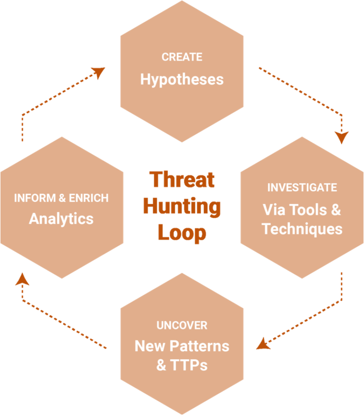 整體來說可以發現 Threat Hunting 的基本流程是 Trigger/Hypotheses(從異常/已知行為或威脅情資建立假設)→ Investigation(蒐集證據)→ Uncover(進一步分析)→ Inform & Enrich,並且在威脅狩獵中這流程會持續循環。