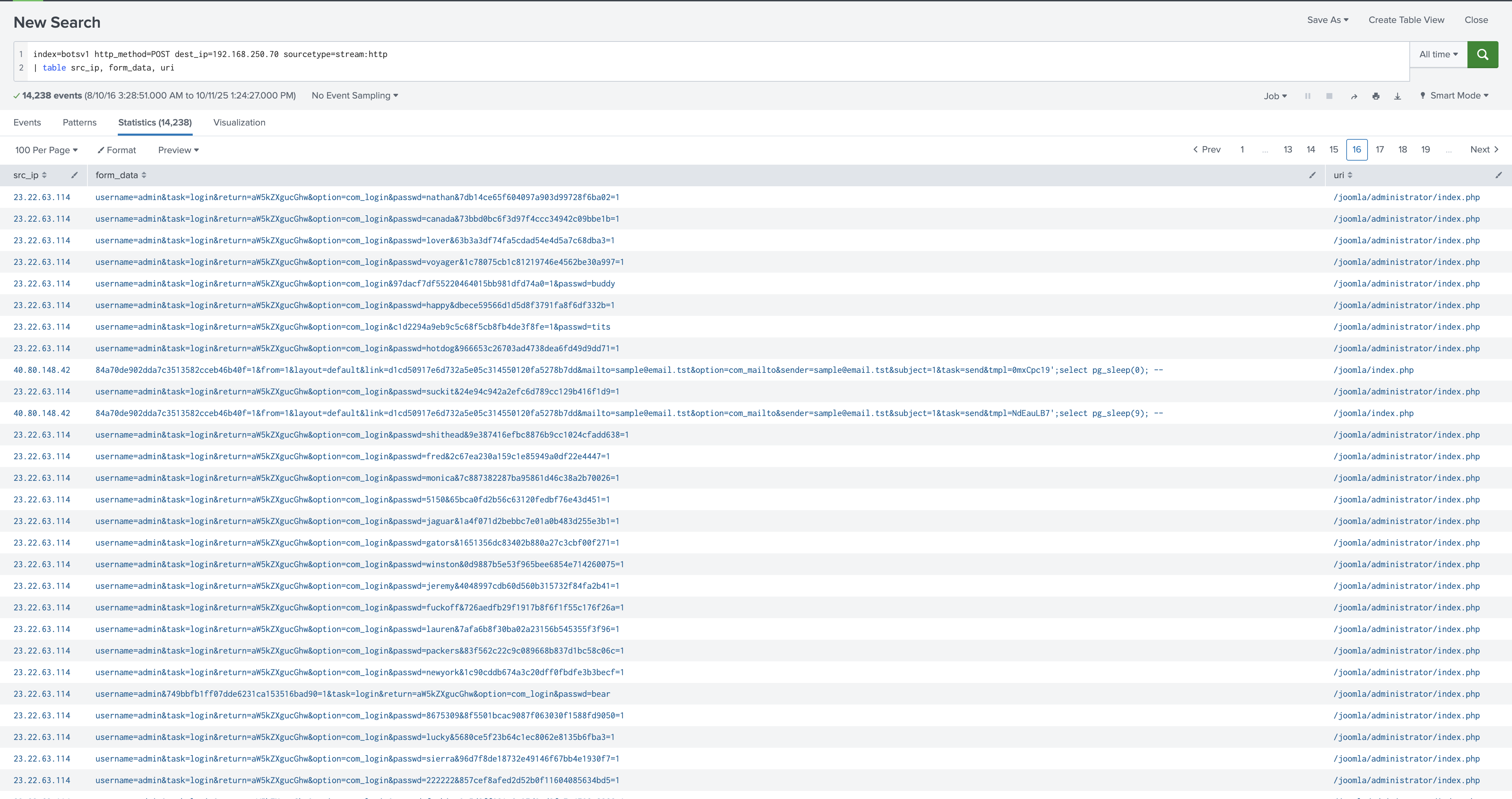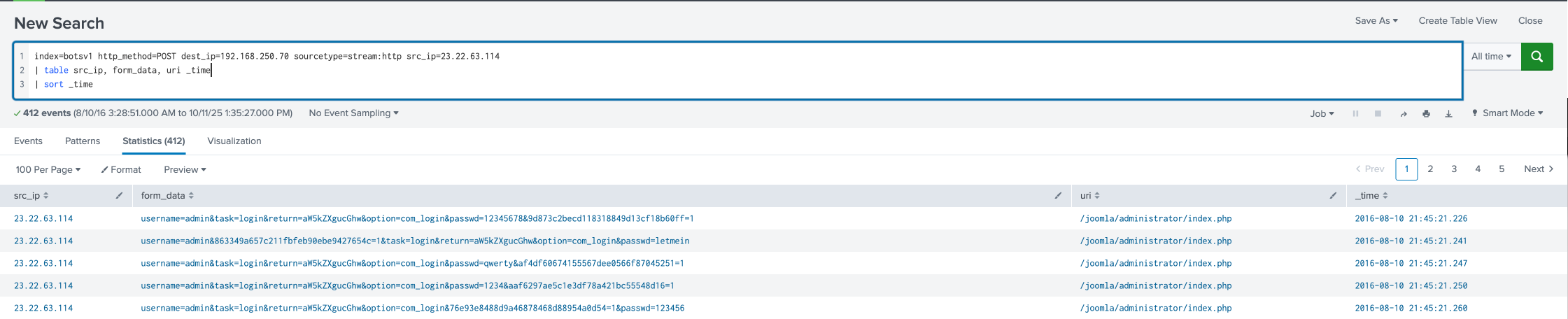 index=botsv1 dest_ip=192.168.250.70 sourcetype=stream:http http_method=POST uri=/joomla/administrator/index.php