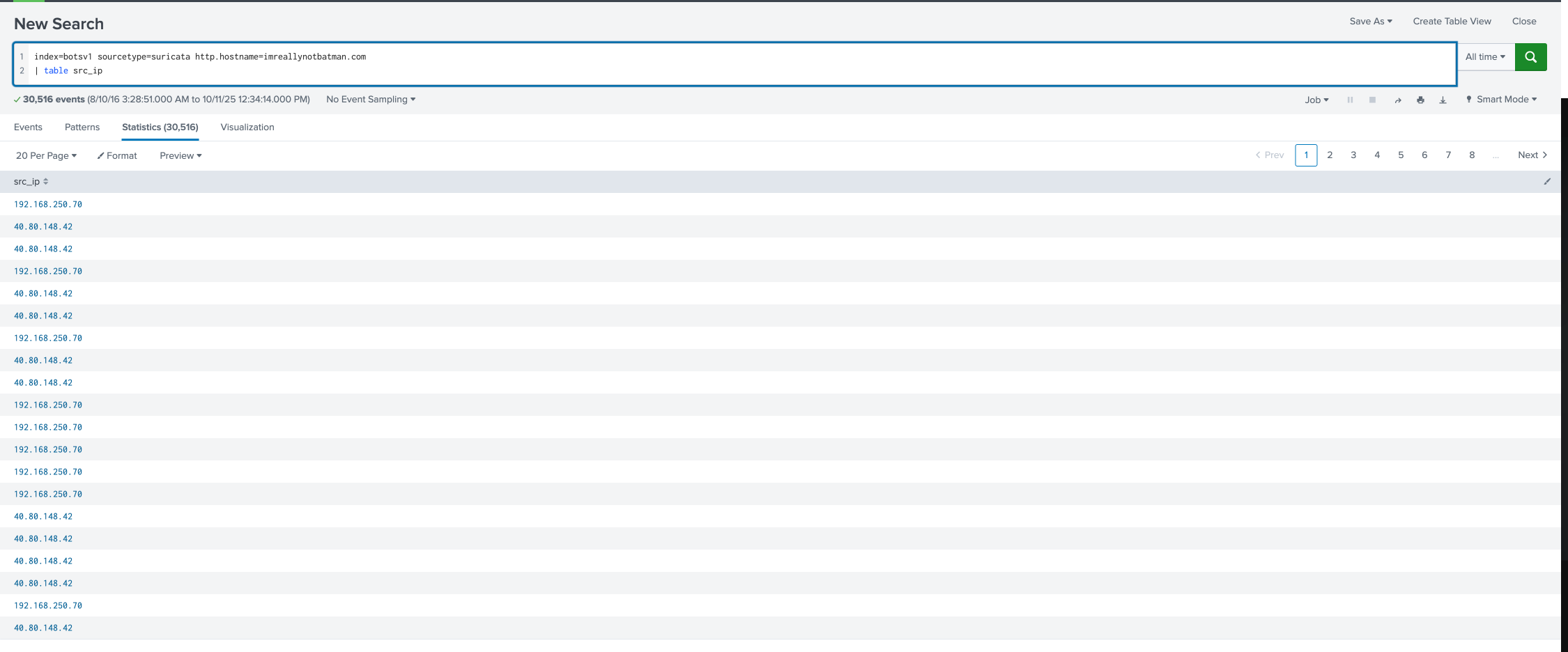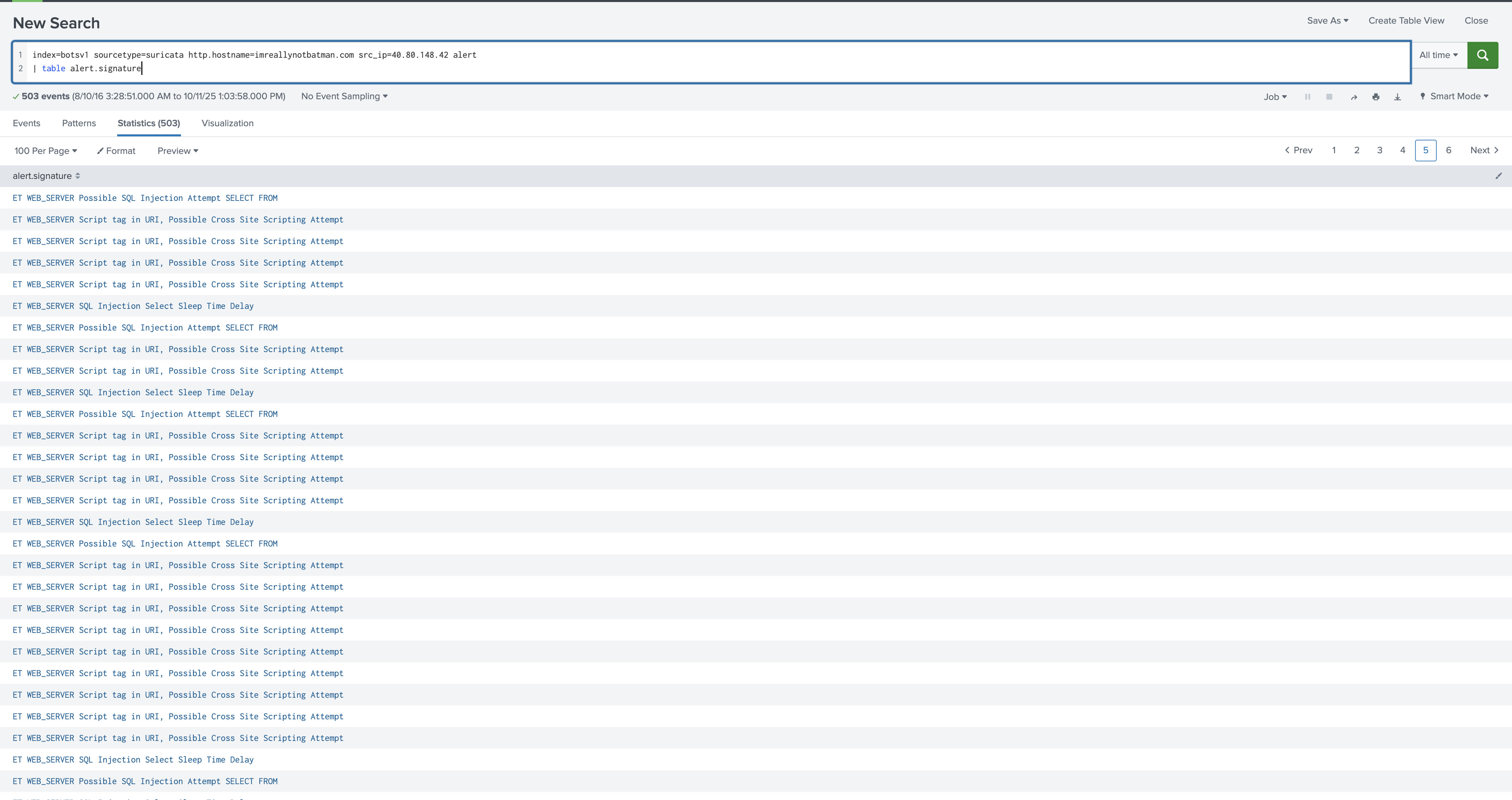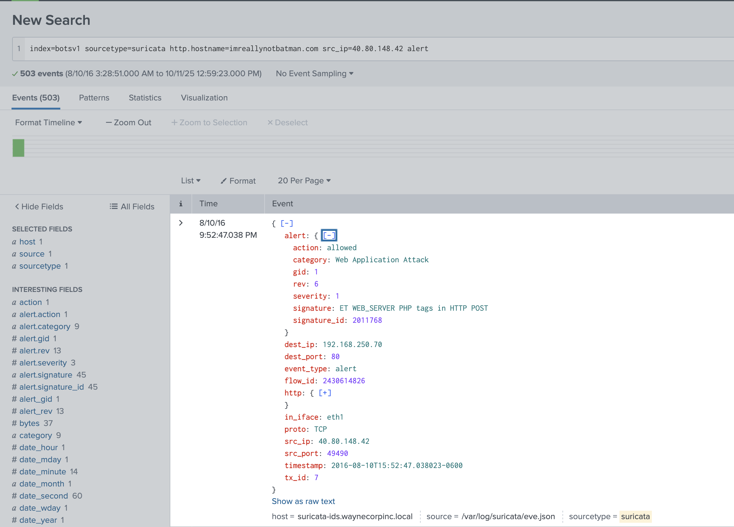index=botsv1 sourcetype=suricata http.hostname=imreallynotbatman.com src_ip=40.80.148.42 alert