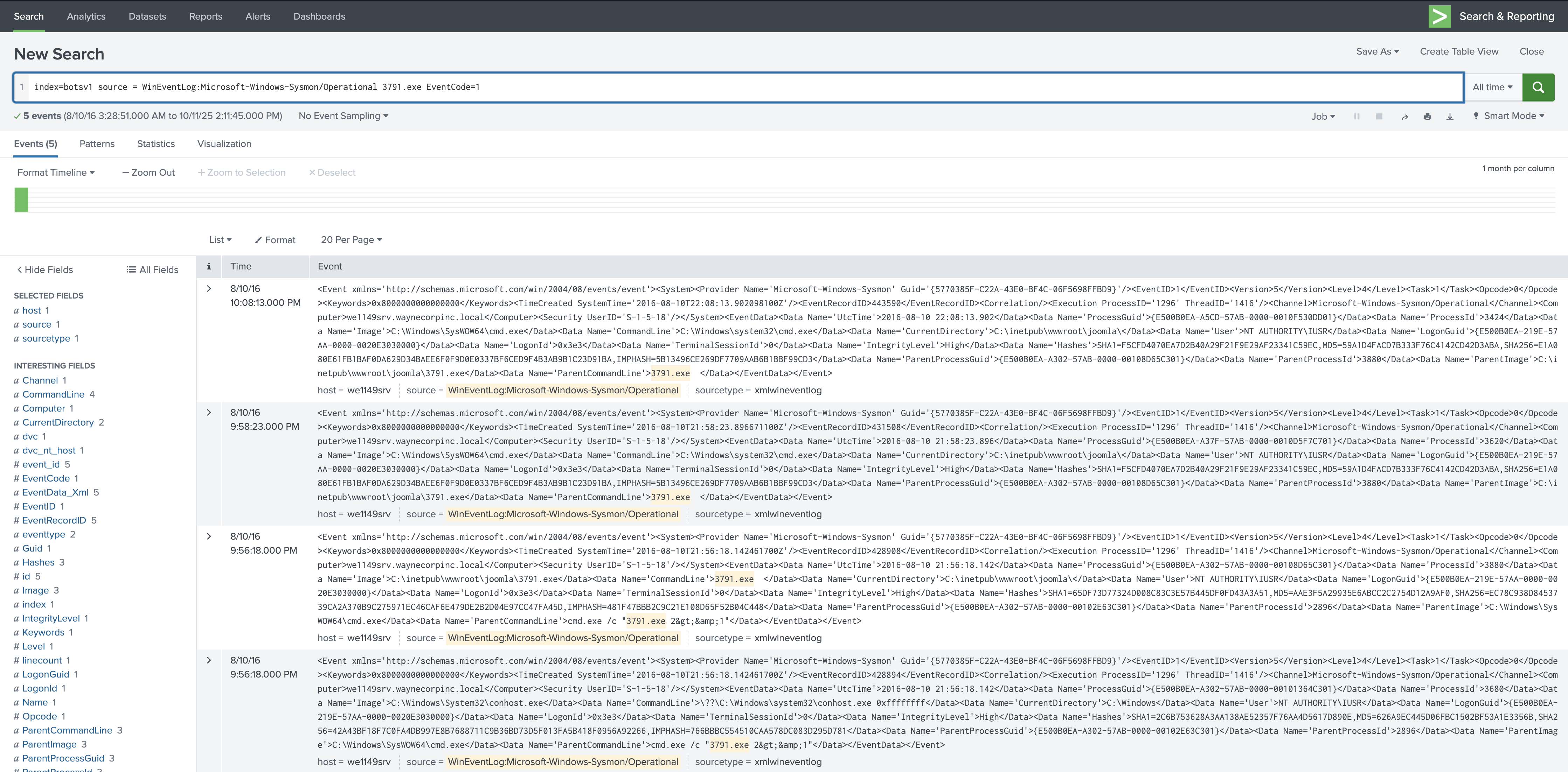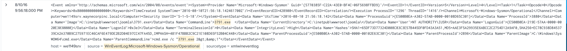 index=botsv1 source = WinEventLog:Microsoft-Windows-Sysmon/Operational 3791.exe EventCode=1