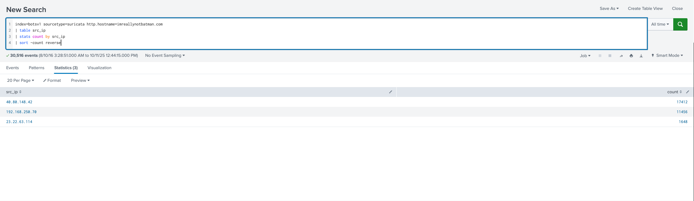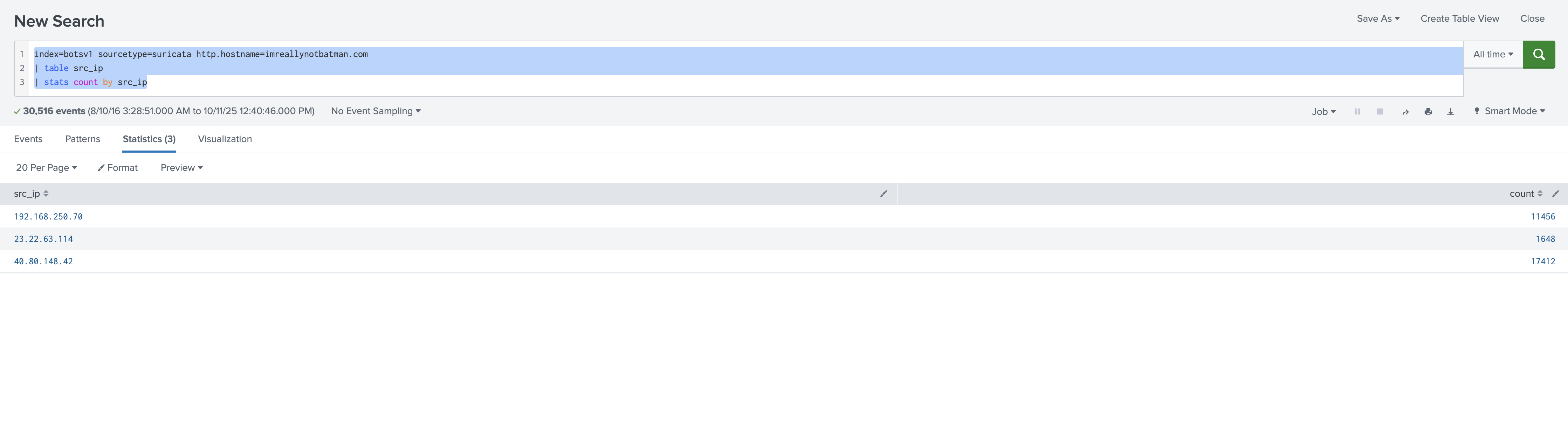 這邊我們獲得了每個 Suricata log 的來源 IP,接下來進行統計,因為我想要得到的是這個 IP 出現幾次,數量很多會有很高的機率是進行掃描,所以接下來會使用到 stats 語法,它提供了一些基本的統計功能。