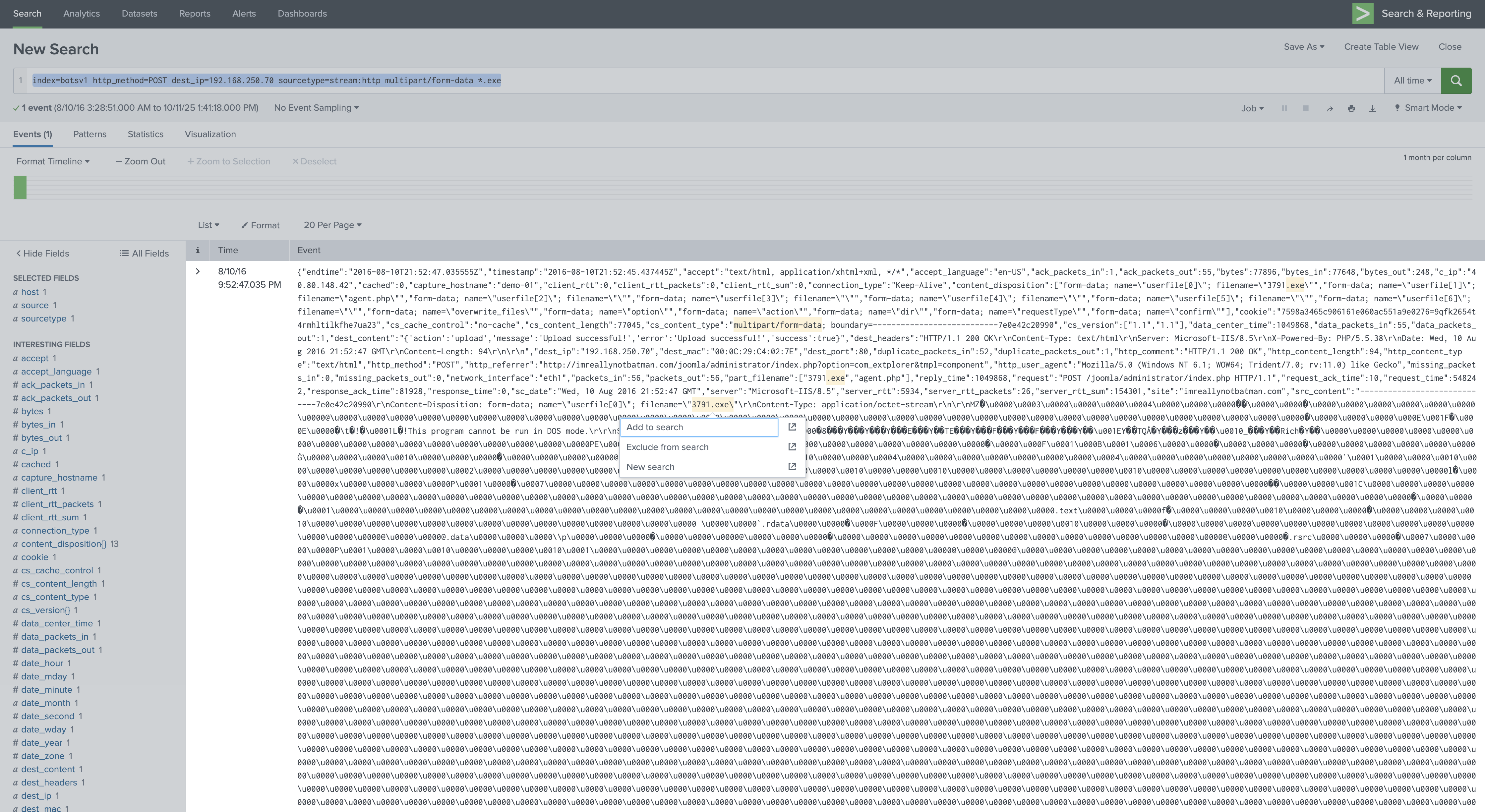 index=botsv1 http_method=POST dest_ip=192.168.250.70 sourcetype=stream:http multipart/form-data *.exe