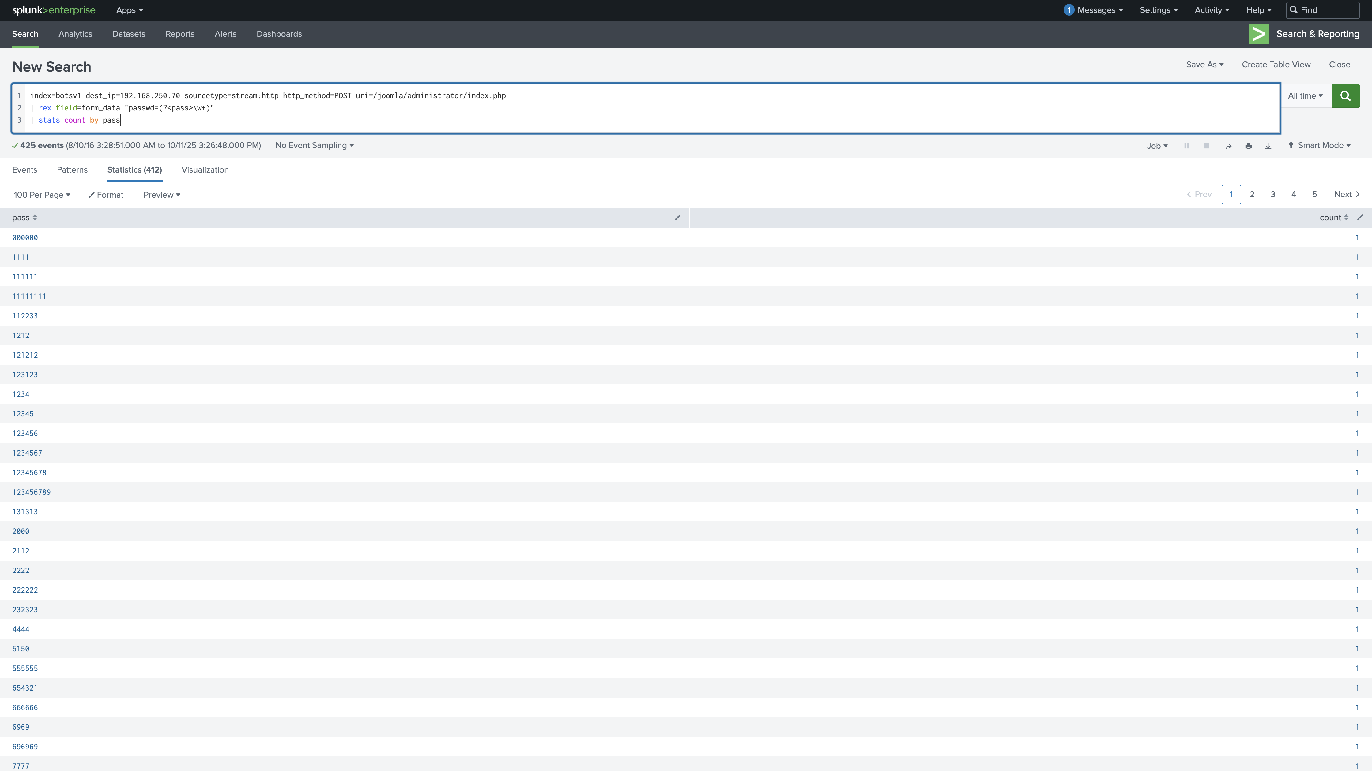 ,並且它是用暴力破解的方式嘗試登入系統,所以如果有一個密碼與其他登入次數比其他的還多就有可能會是正確的密碼,但是它的密碼是放在 form_data 欄位,這個欄位會包含其他的文字資訊,因此我們會需要用到 rex 語法: