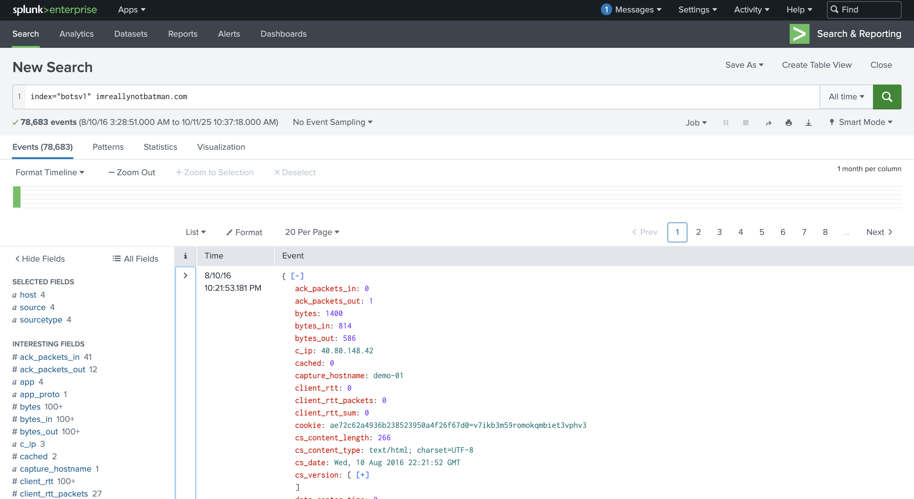 這段搜尋語法的意思是在資料索引為botsv1中,找出字串中包含 imreallynotbatman.com