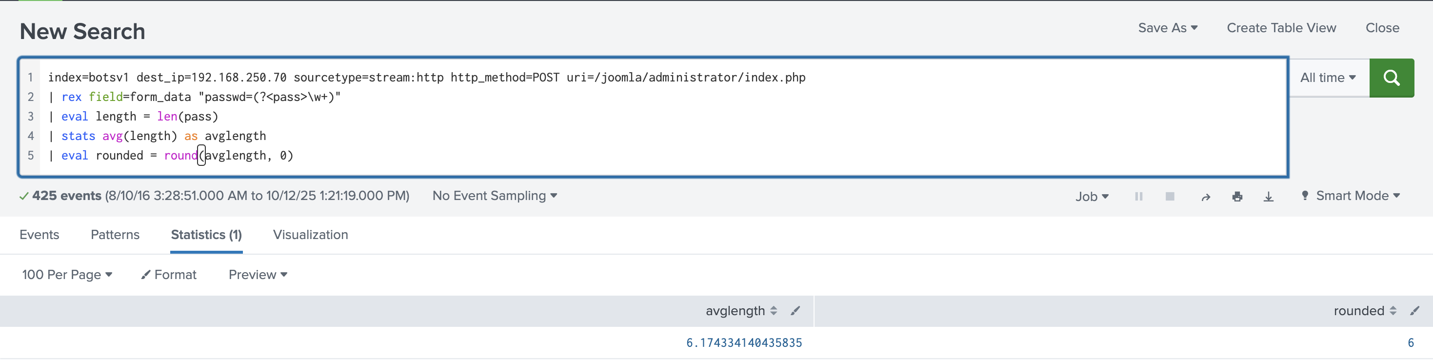 我們將pass提取出來後,使用len計算每一個pass 的長度,接下來用stats 提供的avg 計算所有欄位的平均長度,最後在使用 eval 的 round 幫我們做四捨五入操作