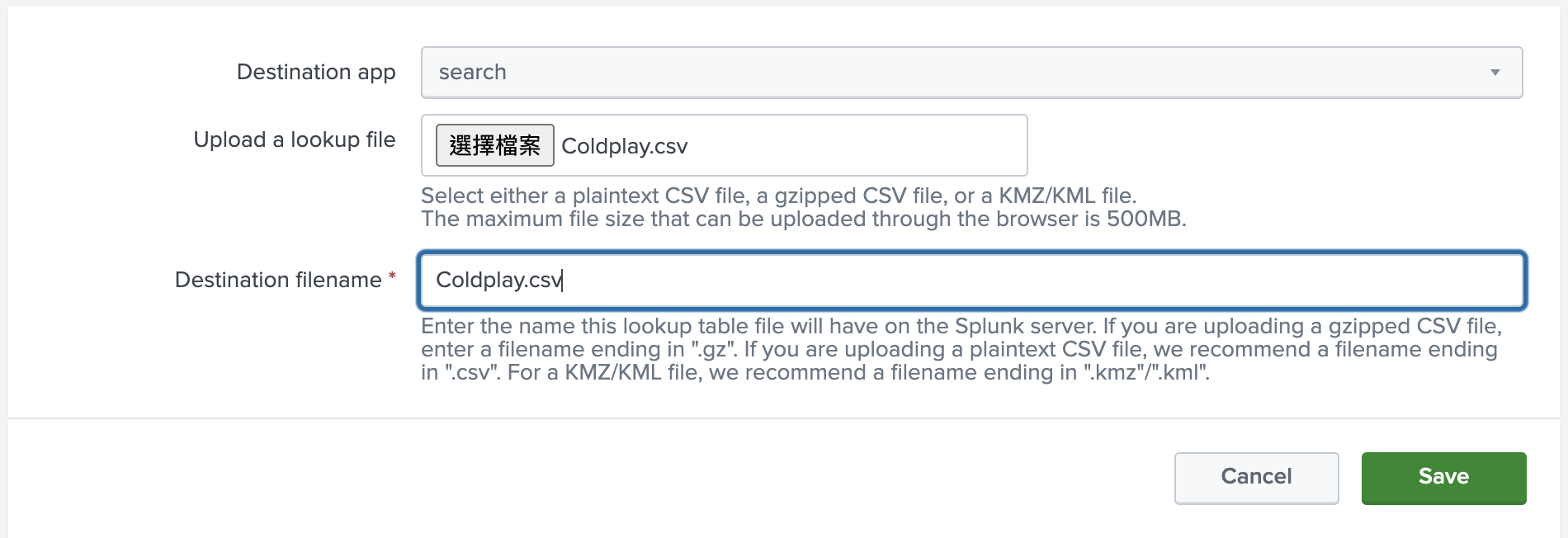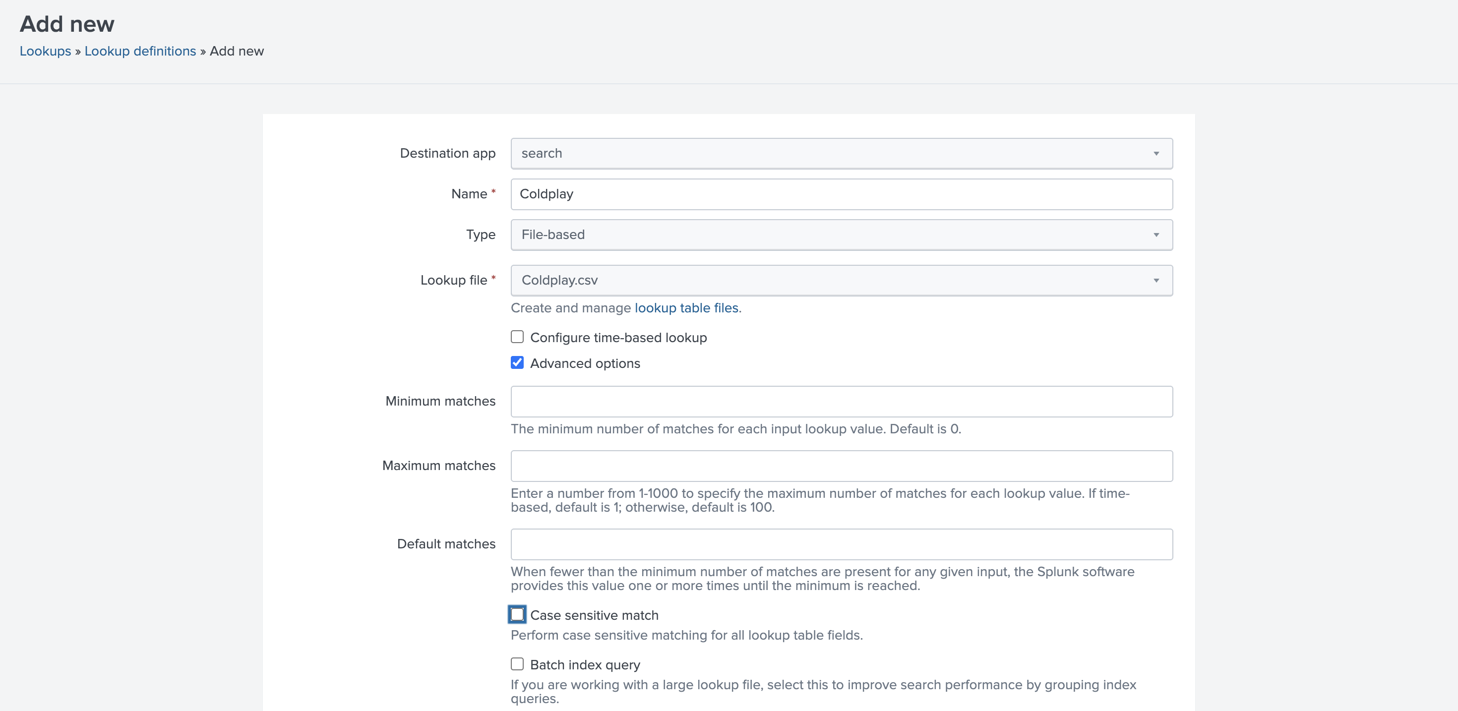 點選 Lookups 的首頁的第二行Add new ,接下來去指定剛剛丟進去的 csv 表,要記得開啟進階選項把 Case sensitive match 取消勾選