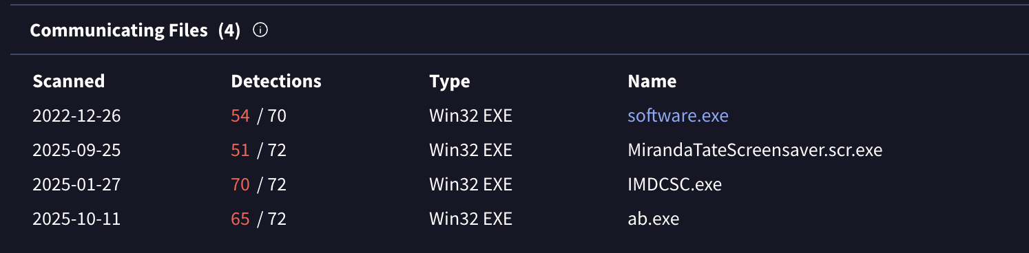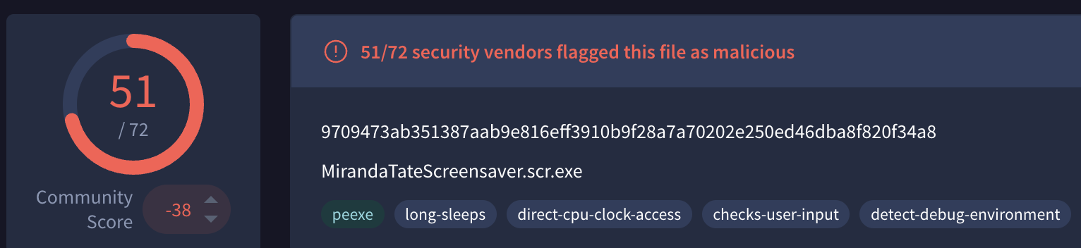 那經過嘗試答案會是 MirandaTateScreensaver.scr.exe ,點進去後就會拿到這個惡意程式的 sha256