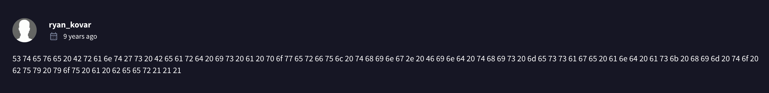ans : 53 74 65 76 65 20 42 72 61 6e 74 27 73 20 42 65 61 72 64 20 69 73 20 61 20 70 6f 77 65 72 66 75 6c 20 74 68 69 6e 67 2e 20 46 69 6e 64 20 74 68 69 73 20 6d 65 73 73 61 67 65 20 61 6e 64 20 61 73 6b 20 68 69 6d 20 74 6f 20 62 75 79 20 79 6f 75 20 61 20 62 65 65 72 21 21 21