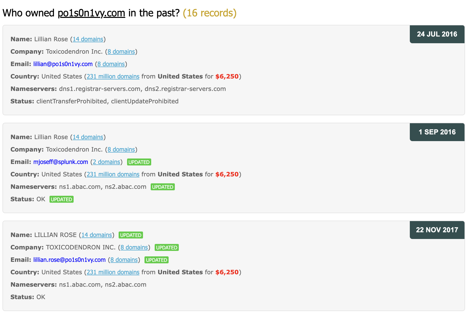 Q16 : Web Defacement: One of Po1s0n1vy's staged domains has some disjointed "unique" whois information. Concatenate the two codes together and submit them as a single answer.