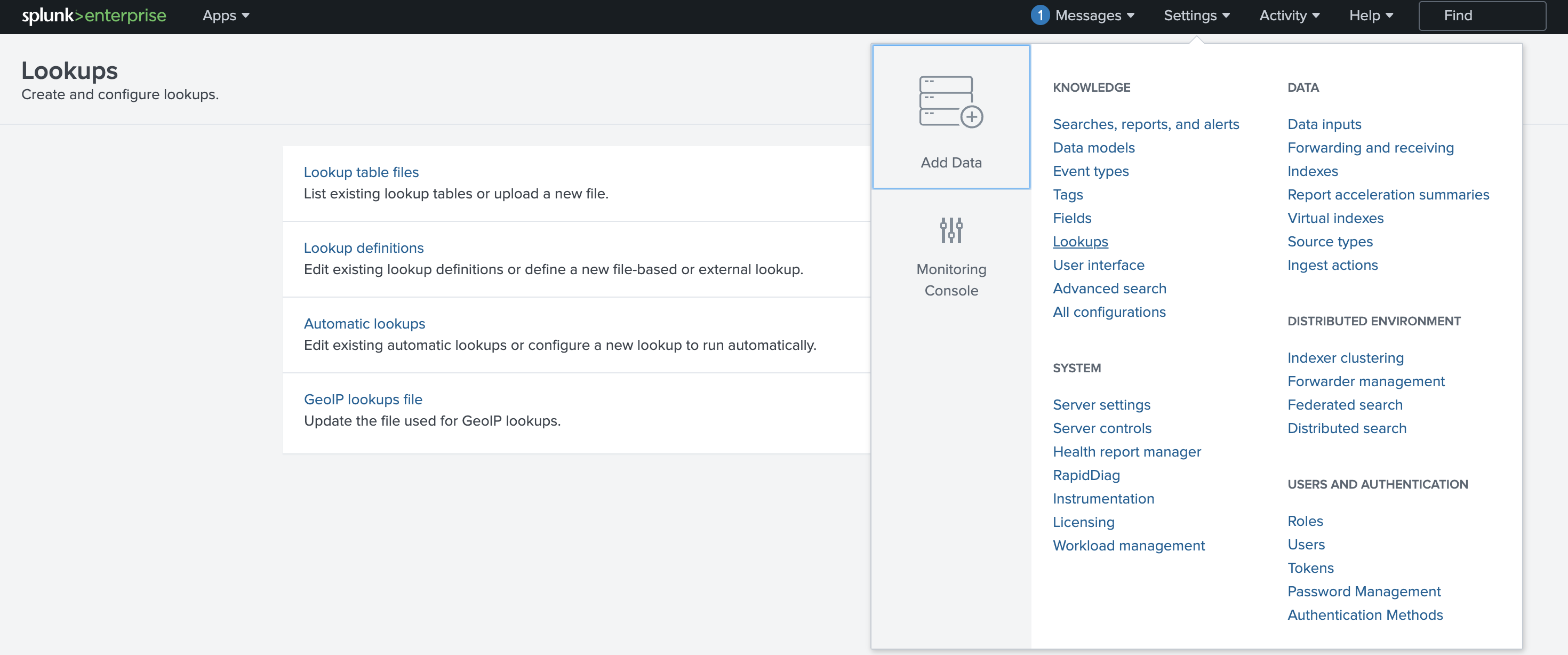 接下來我們要匯入到 splunk 中,選擇Settings->Lookups