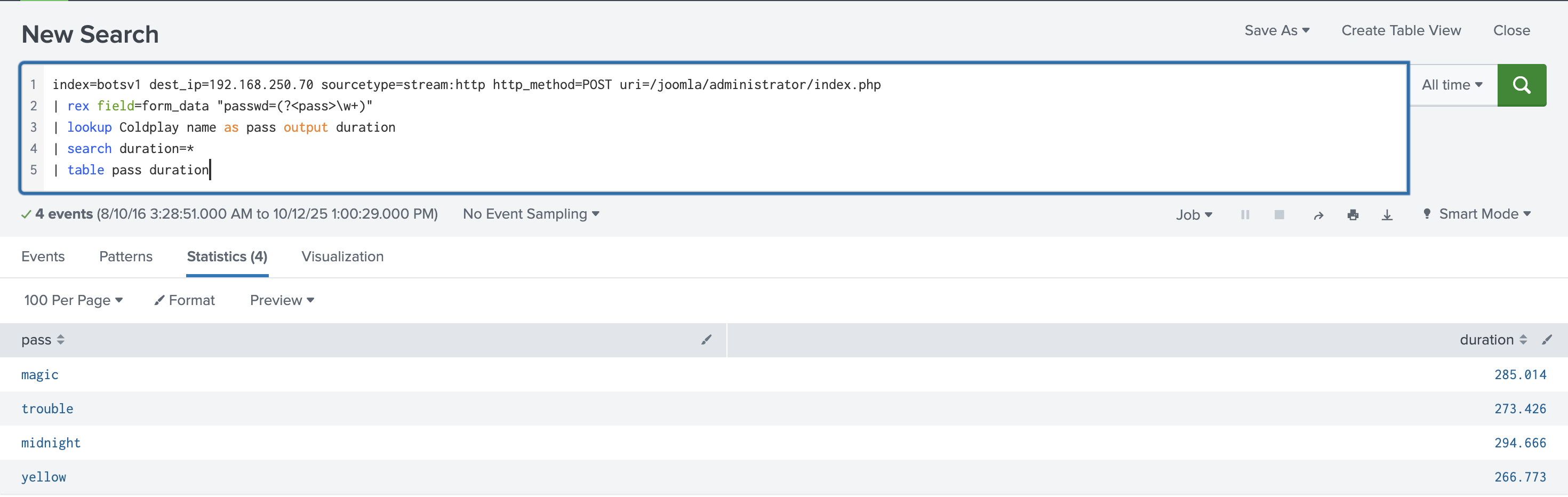 而加上search duration=* 是因為只有被對應到的 pass 會出現duration,因此加上這個保證出來的會是匹配到的