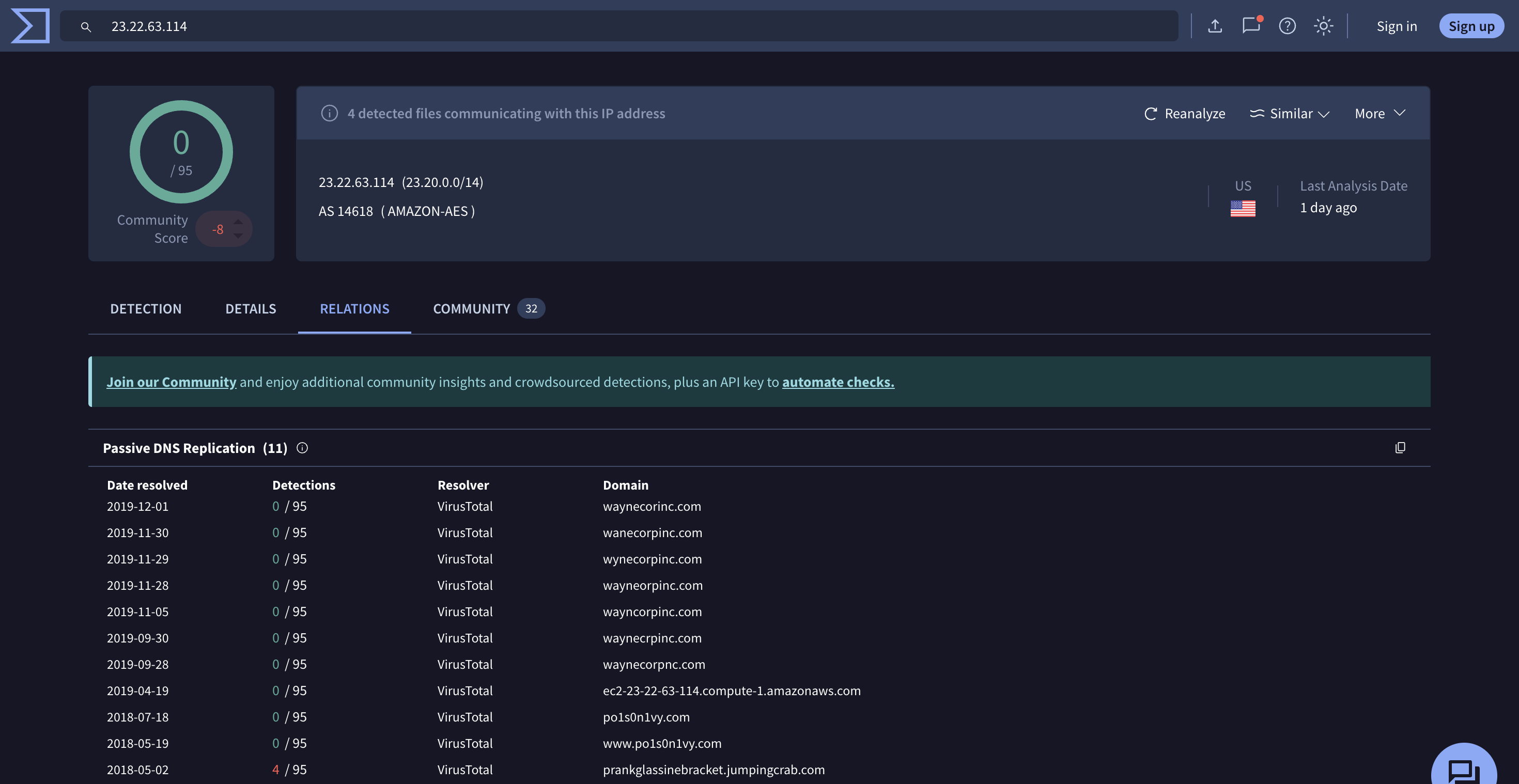 在 VirusTotal 中,關於 IP 會顯示之前出現惡意軟體與這個 IP 連線的功能,因此我們將23.22.63.114 丟進 VirusTotal 中,並選擇 Relation 頁面。