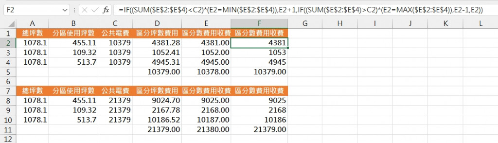 =IF((SUM($E$8:$E$10)<C8) * (E8=MIN($E$8:$E$10)),E8+1,IF((SUM($E$8:$E$10)>C8) * (E8=MAX($E$8:$E$10)),E8-1,E8))